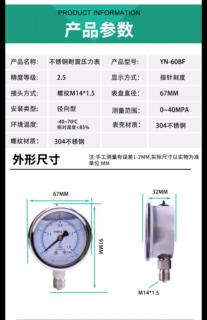 YN60BF不銹鋼耐震壓力表